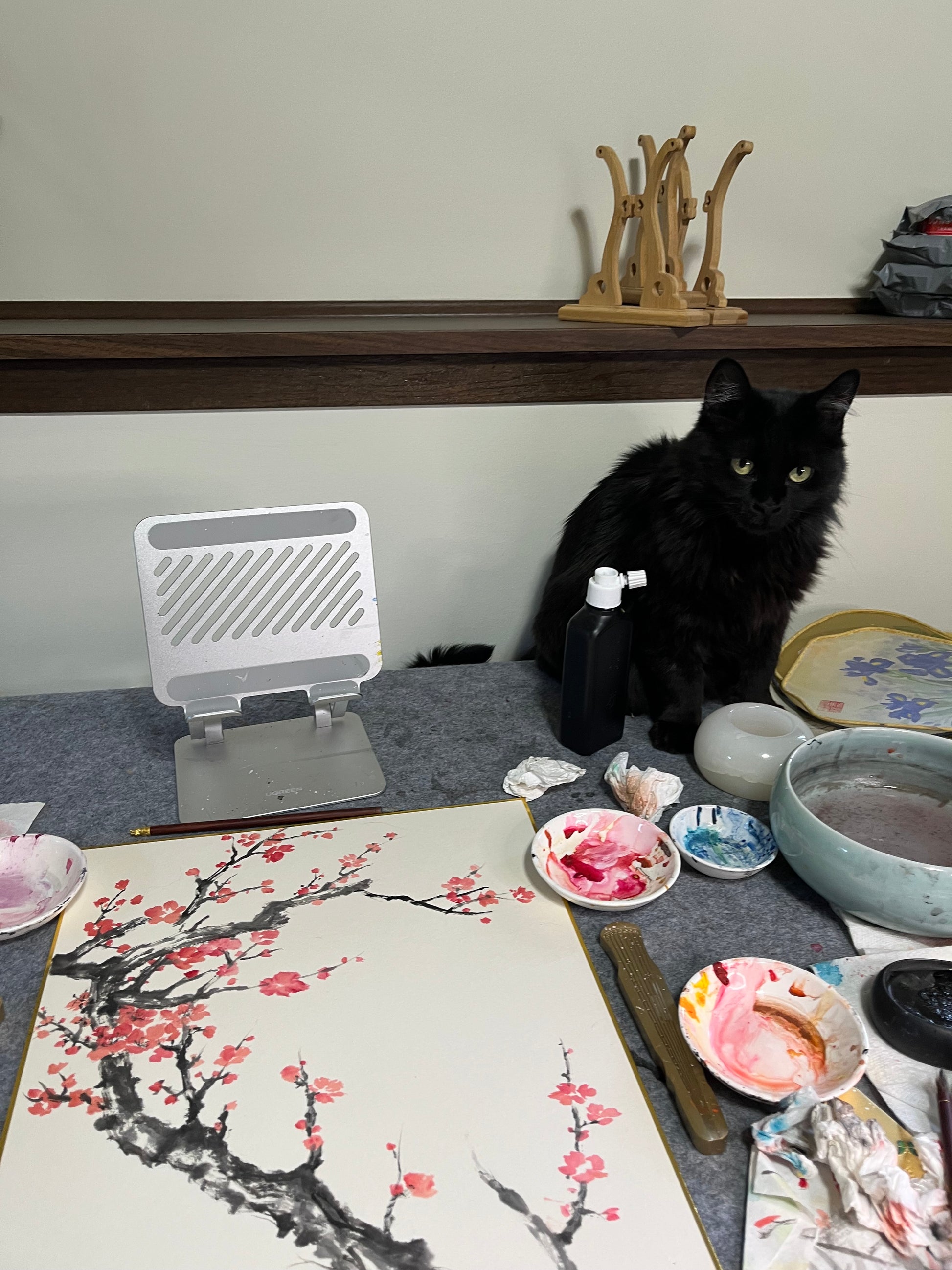 traditional Chinese brush painting on Xuan (rice) paper. Use nature pigments from herbs and minerals. Use handmade traditional animal fur brushes.