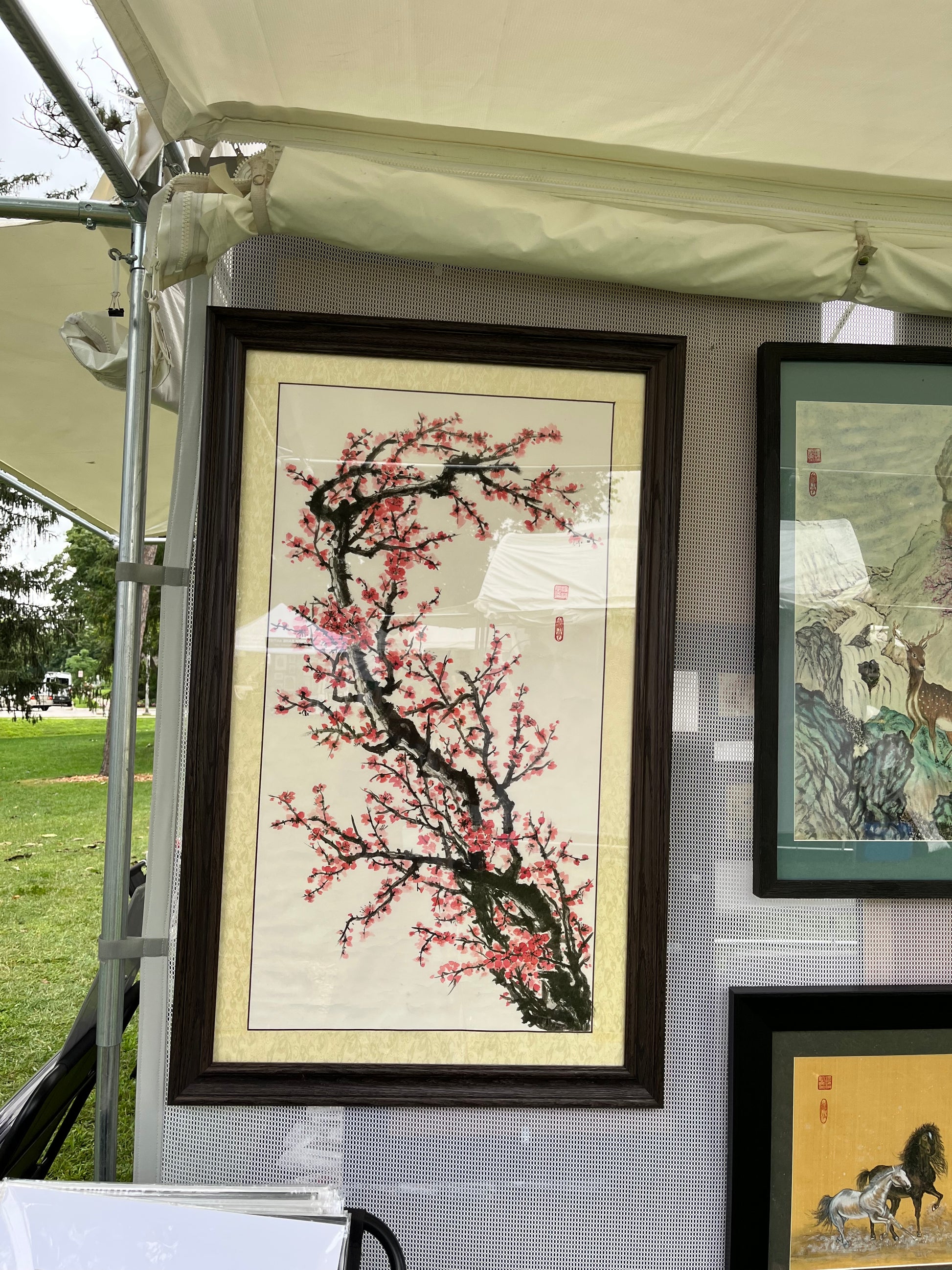 Traditional Chinese brush painting on rice paper scroll. Framed with Silk blend fabric